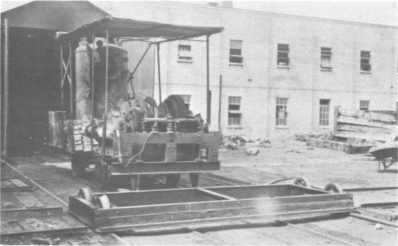 The locomotive comprised a platform carried on four double-flanged wheels. At one end was a vertical boiler (pressed at 100 lbs) which drove a two−cylinder marine-type winch mounted at the other end. A cog on the winch drove a shaft between the wheels by a heavy chain, and other chains transmitted the power from this shaft to the wheels. Beside the boiler was a low rectangular water tank. The boiler, chimney and safety valves protruded through the cab roof which was supported by a pillar in each corner, and the exhaust from the winch had a separate pipe up the back of the boiler. The traverser was coupled to the winch end of the locomotive.