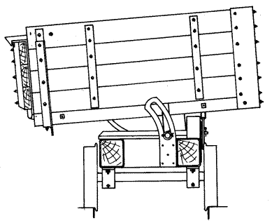 The wagon frame consists of two oak beams 9in by 8in in cross section and 10ft 5in long, with three transverse members and the two diagonals between them. The body is 8ft 7in x 6ft 0in x 2ft 8in deep and constructed of 2in thick elm boards of varying depths. Bolts are used in the construction of the wagon which is generally of very substantial manufacture. The body is tipped on three curved wooden supports, faced with metal, running in channel girders on the transverse frame members. On the door side of the body, a pair of bent L−girders keeps the ends of the body from spreading. The wheels are 1ft 7@in diameter and 2ft 10in back-to-back; the wheelbase is 5ft 0in. The axles run in the usual "n" slot, with a bolt across the opening of the "n" to stop them from falling out.