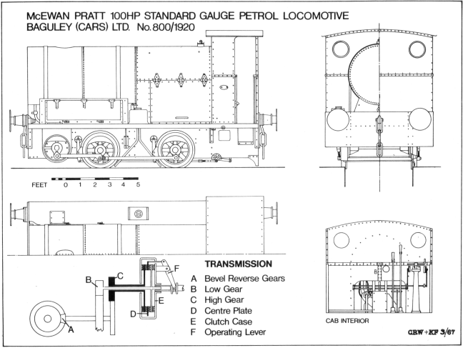 hp 0−4−0 petrol hydraulic laid down several years earlier; this last was not completed and the frames were used for Baguley's only standard gauge steam locomotive, works number 621 (officially 2001). No.800 was left on the builder's hands until 1933, fulfilling the virtual sinecure of works shunter. It was painted white in its early days and must have been a most impressive piece of publicity material. Eventually it was sold to a forerunner of the London Brick Company and went to the King's Dike Works at Whittlesey, where it worked until about 1950, being then transferred to the nearby Gildenburgh Works for the remaining fifteen years of its active life. A mechanical failure almost coincident with the "rationalisation" of local main-line freight services (British Railways closed the Works sidings made it redundant in late 1965 and at the time of writing, it awaits a decision on its future. I hope that this example of an early internal combustion locomotive will be preserved as it is in virtually original condition and an excellent example of a McEwan Pratt/Baguley product.