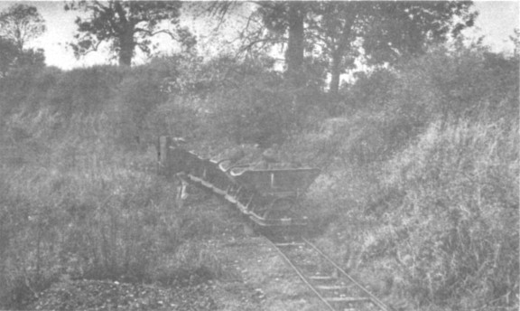 The outstanding feature of this short railway is the track. The rail is of light section and flat bottomed, with earth, mud or leaf mould ballast; a stream flows over the sleepers between the engine shed and the first bridge. In several places old sleepers have been wedged between the rail and cutting side to stop the track moving. The cutting sides are covered with bushes and trees which overhang the track so that branches brush continuously against the train. The curves are so sharp that even when wagons are being pushed and the inside buffers are in contact the coupling is taut. Even a short railway like this is not immune from vandals, who recently dislodged the capping stones on a bridge parapet and pushed them off on to the track.