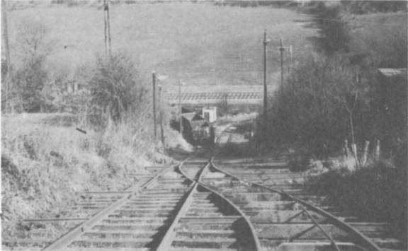 In about 1900 sidings were laid at the head of the incline so that colliery dirt could be tipped oh either side, whilst the track oh the lower part of the incline was singled and a point inserted. The northern side of the triangle was completed, and henceforth empty wagons were kept here to await hauling up. Full wagons were then run into the southern siding until picked up by the GWR locomotive. An interesting point about the northern curve is that the check rail (both curves are very small radius is oh the outside of the outer running rail.