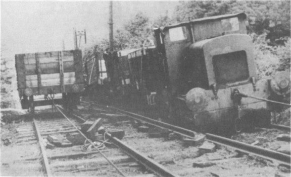 Most inclines have their tales of runaways and Kilmersdon is no exception. The photograph (above) shows the most destructive which is believed to have occurred in the mid-1950's. The little Ruston diesel was unable to control the wagons it was shunting, and was pulled over the top, the driver luckily jumping clear. The wagons were badly damaged, nor was the diesel unscathed. To clear away the debris, a wagon was lowered on the other track and bits of wagon and coal loaded into it. The resultant load was sufficient to lift the diesel back to the top, when it was relegated to a siding in disgrace. It is this need for braking power that caused the decision to keep the Hunslet from Norton Hill out of use until new brake blocks were ordered and fitted.