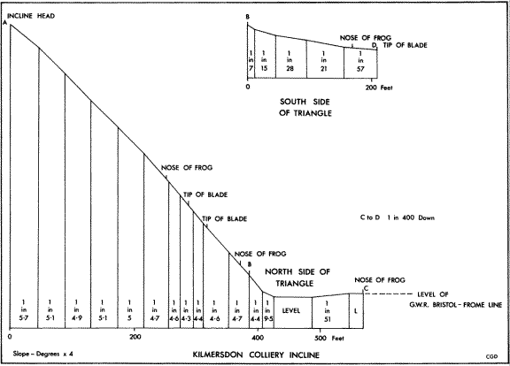 The self-acting incline at Kilmersdon Colliery, near Radstock in Somerset, is the last survivor of many in the Somerset Coalfield. The writer's research into the colliery history of this area is as yet in rather an embryonic stage but it would seem that, apart from Kilmersdon, only Wells Way and Clandown Colliery had standard gauge inclines, unless the second incline at Lower Conygre Colliery (replacing the original harrow gauge one was also standard gauge. There were however at least six other narrow gauge inclines at various collieries and perhaps more have gone unrecorded.