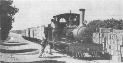Whilst visiting Northern Transvaal in October 1941 I was shown over the vast Zebedeila Citrus Estates, and noted an extensive 20" gauge system with flat trucks for carrying crates of fruit. There was no sign of motive power so I presumed that the trucks were manhandled. However, on leaving, I was astounded to see a steam loco come along and just had time to take a picture as it passed by. Time did not permit me to stay longer and follow it up. On examining the photograph later I found that the loco was almost certainly a "Lawley" engine. Now these locos have a most interesting history of which only a sketchy outline is known to me. They were 4-4-0 tender locos built by Falcon for the 20" gauge Beira - Umtali line in the 1890s, Lawley being the engineer in charge of construction. This line was soon converted to 36" gauge and the locos disposed of and all trace lost. During the first World War, the military authorities acquired some for work in South West Africa, passing them on to the South African Railways after the War was over. In later years they were to sell them again and we hear of one at a cement works, one at a timber concern in Rhodesia (see article in "Railway World", August 1954), and the one I saw at Zebedeila. Reliable information as to makers details or the total built is lacking. If anyone can add to this story it would be very welcome.