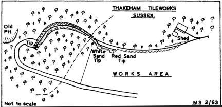 The shed in which the two locos are housed is a long low corrugated iron structure, situated in a small hollow and surrounded by Forestry Commission pine trees. The track out of it runs sharply uphill to the works level, and then reverses to go uphill again on to a low embankment. Soon a siding, on which the dumps of white and red sand are situated, joins on the left and the line curves to the left into a cutting, having crossed a footpath by a bridge. The cutting deepens and the track, levelling out, enters what appears to be a tunnel but what in fact are the hoppers where the skips are loaded with sand. Because too much of the hillside was being removed, the firm had to stop digging sand in a pit behind the hoppers. It is now, therefore, brought by road from the nearby Washington Pits of Hall & Co. Ltd.