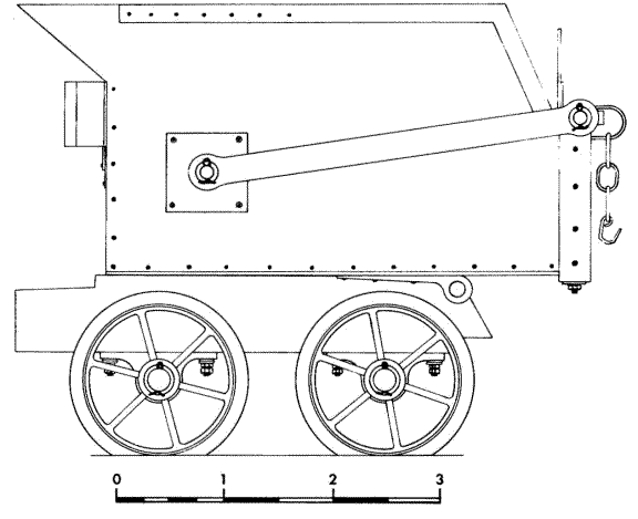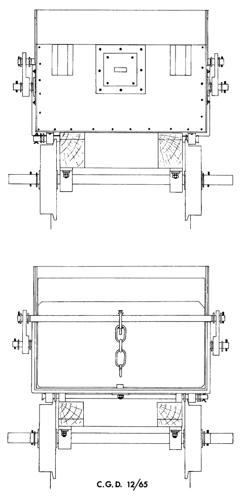 The body has a capacity of about 34½ cubic ft. There is a door at one end which is prevented from opening by a stop in the floor. The frames are wooden beams 6in by 8¾in by 4ft 5in with transverse members. The wheels have a diameter of 17in, the wheelbase is 25in and the back-to-back measurement is 31½in. The shape of the body allows the wagons to be shunted close together, an advantage at the foot of the incline where space is restricted; indeed, superficially a set of wagons looks like a single articulated unit. However, coupling is by a D−shackle, chain and hook on the body. The buffers, lengths of flat bottom rail, are welded to the body also, and not to the frames as is more usual.