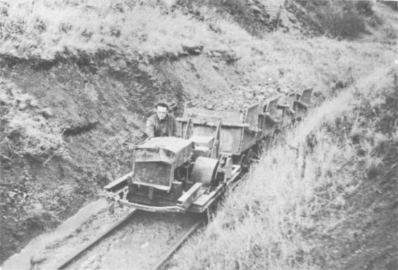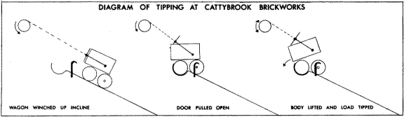 In use, the wagons are run as sets of four. A set is loaded by mechanical shovel at. the pits and towed by a home-made petrol locomotive to a loop, after which it is propelled to the foot of the incline. This being single track, the wagons are hauled up individually, the method of tipping being shown in the diagram. As the wagon is hauled up, there is no tendency for the door to open as both cable and door pivots are in line. At the tip, the leading wheels drop into a "U" formed by bending the rails. As the winch is much higher, the door is lifted up until the cable and pivots are again in line when the body tips and the load is emptied. It the cable is wound further, the whole wagon is tipped up but the extended rear axles catch in lineside stops and prevent it from going over too far.