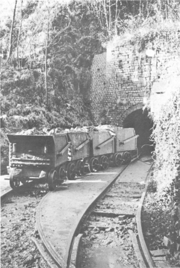 On the line are about ten wagons of a local design, adapted to the peculiar tipping arrangements. The wagons at present in use were probably built half a century ago although the design dates back to pre-1900 when the railway was horse-worked. The iron bodies were purchased (possibly built by Charles Hill of Bristol) but the wooden frames were made by the Company.