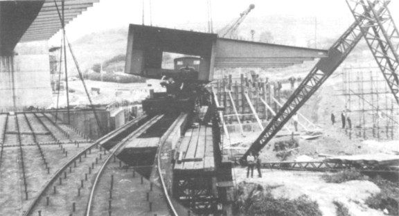The principle components of the viaduct were the main longitudinal box girders, each 50 ft. long and weighing 25 tons, which in some cases arrived at the site with the rails for the contractor’s railway already in position on them. These girders were carried out to the erection point on two specially built bogies, which were simple steel trolleys 12ft long and 6ft 6in wide with four double flanged wheels and a single central bolster that could swivel to accommodate curves in the track. Each bogie was designed to carry 15 tons and ran on 5ft 2½in gauge track. The locomotive though was 3ft gauge, the broader gauge being used in order to ensure stability when moving a load in a high wind; the track therefore was mixed gauge, the outer rail being common to both gauges.