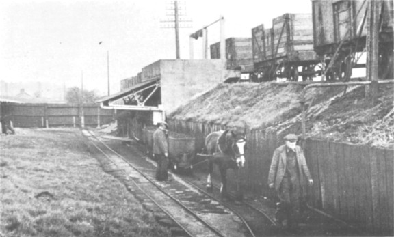 The North Western main line here runs on an embankment. The local gasworks was situated on the west side of the line about ¾ mile north of the station, but the goods-yard (now abandoned and converted to a car park) was on the east side, and had an extension siding for gasworks coal traffic. This terminated at a kind of small staithe where coal was trans-shipped into small narrow gauge wagons for conveyance to the gasworks which was about ½ mile away on the other side of the line. From the coal stage the line immediately dived through a small tunnel in the main line embankment, from whence it emerged to run parallel through to the gasworks. The gauge was 18½in and the trains were worked by a horse; there were never any locomotives.