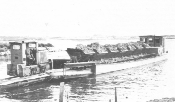 "De Steenwaard" Brickworks, near Wageningen Diesel or no, this 700mm gauge "train ferry" makes a charming and unusual scene. Orenstein & Koppel 25652 of 1955 heads for the brickworks whilst the barge returns to the clay pits. (R.J. Brettschneider)