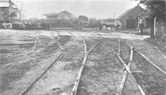 A set of eleven National Coal Board photographs yield much information about the tramroad. The main line was single with passing places at intervals. Between the rails the ground was always made up level with the tops of the sleeper blocks to provide a clear surface for the horses. Outside the rails it would appear that the ground was more often level with the tops of the blocks than not. The rails which were about a yard long and of L−section were thicker and taller in the centre than at the ends. They were spiked to the sleepers, either through a notch at the end of the rail so that one spike secured two rails, or through a hole about an inch from the end so that one spike was needed for each end of each rail.