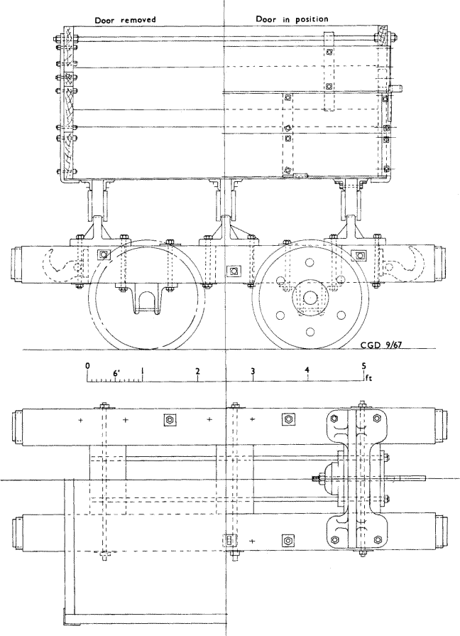 On the top of the frame members opposite the door was an eye and chain, used to secure the body. On the side of the frame here was fixed the 4in by 2in brass plate with the number engraved upon it. No.3 was the frame principally used in the drawing. There seems to have been about fifty wagons in all when the system was operative, plus a few U−shaped metal side-tippers.