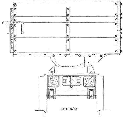 Internal dimensions of the body varied rather. That measured was virtually square, at 5ft 6in long and 5ft 7in wide, with a depth of 2ft 9in. The floor was of metal sheet, sometimes bent over the open edge of the body (not shown in the drawing) and the tipping channels were bolted direct to the floor. Square-headed bolts were usual, although some bodies were made with hexagonal ones, at least in part.