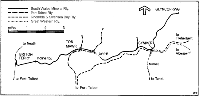 The SWMR is about twelve miles long from Briton Ferry to Glyncorrwg. Between Briton Ferry and Incline Top is an incline of about 1 in 10. The coal wagons are let down by a wire cable controlled by a braked wheel at the top. From Incline Top to Glyncorrwg the line is a single one, about eleven miles in length, with passing places for trains at Ton Mawr and Cymmer, 3½ and 7¾ miles respectively from Incline Top. At Ton Mawr a connection is made with a branch of the Port Talbot Railway, and at this place is a signal box for working the traffic on to and off that railway. The signalman is appointed by the Glyncorrwg Colliery Co, and the Port Talbot Railway pays half his wages. This signal box is in telephonic communication with Incline Top only. At Cymmer there is a small office and a weighbridge with telegraphic communication to both Incline Top and Glyncorrwg. At this place there is a siding connection with the Great Western Railway. There are three trains daily each way, timed to pass at Cymmer unless special instructions are issued by the traffic manager at Briton Ferry or Glyncorrwg for the trains to be worked otherwise. The gradients are not severe for this class of line, the steepest being 1 in 70, and the trains are not as a rule very heavy.