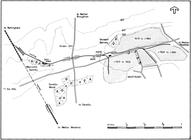 Beyond the buildings the line curved east-north-east running in a shallow cutting now filled with trees and bushes. It was elevated to cross the Nether Broughton-Saxilby road (the bridge has long since been pulled down) and beyond ran on a grassy embankment enjoying a wonderful view over the Vale, before turning east in a shallow cutting towards the Ab Kettleby road; another pond is passed and the line entered a grove of trees and finally reached the road by a group of buildings referred to as "Stonepit House". Just before this, a branch turned off south, crossing the road by a level crossing between a couple of modern bungalows. The "Stonepit", I fancy, is a lot older than the tramway, suggesting a quarry for building stone, not iron extraction. Beyond this point ground on both sides of the road has been quarried, and there were two more level crossings, no obvious traces of which now remain. The quarrying area is revealed by the shallow depressions in the fields so characteristic of the old outcrop ironstone quarries in the Marlstone beds of Leicestershire. The lines serving these quarries were slewed as required. However, the main tramway was a permanent feature and is still readily traceable from end to end, as described, though it has been lifted for close on forty years; rather a contrast to systems such as Scaldwell and Pitsford, closed in the 1960's and bulldozed out of recognition.