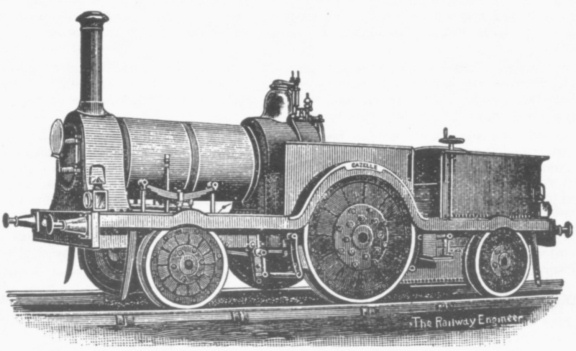 "The cylinders are, as will be seen, steeply inclined, so that the motion bars may clear the leading crank pin, while the eccentrics are arranged between the boss of the driving wheel and the axle bearing, the valve gear being outside the frames.