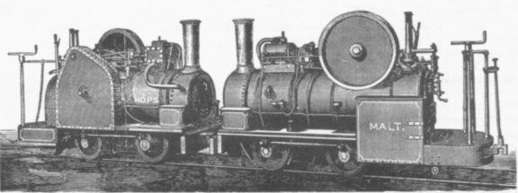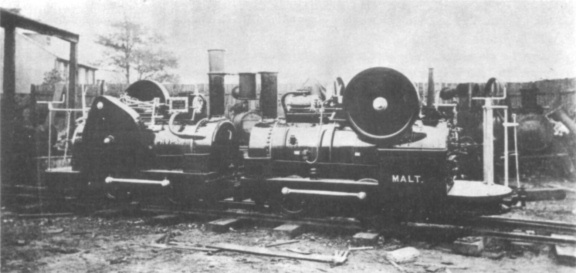 (This is a most interesting photograph and although the print is rather dense and may not reproduce clearly we feel it is well worth publishing. In the background to the right of MALT are two boilers, the one to the left appearing to have a spoked flywheel on its near side; another spoked flywheel can be seen immediately behind MALT's brake handle. More visible is the boiler by the fence behind the smokeboxes of HOPS and MALT. The boilers of both locomotives are elaborately lined out, and it will be noticed that the names are followed by a full stop. On the cylinder casting of HOPS appears LEWIN ENGINEER POOLE DORSET (in three lines) but without any construction date. It is interesting to compare this photograph with the engraving in The Engineer (reproduced by kind permission in this issue) and to note the absence on the latter of the hinged lighting-up chimneys. We wonder whether these would be permanent fixtures? - Hon. Eds.)