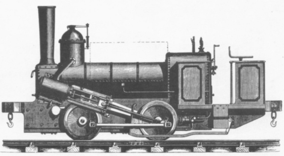 The paragraph in Engineering which accompanied this engraving said that it illustrated "a type of contractor's locomotive constructed by Mr Stephen Lewin, of Poole. The particular engine illustrated is for the 4ft 8½in gauge, but similar engines are made for gauges down to 3ft. The cylinders are 9in in diameter, with 18in stroke, while the wheels are 2ft 6in in diameter, and are arranged with a wheelbase of 5ft. The water is carried in two tanks, which are connected and bolted up between the frame plates, so as to act as stays to the latter, and keep the centre of gravity low. The total weight of the engine empty is 8½ tons, and loaded 10 tons, while, when required for long runs or heavy gradients, a tank can be placed at the top of the boiler, thus adding about 1½ tons to the weight in working order.