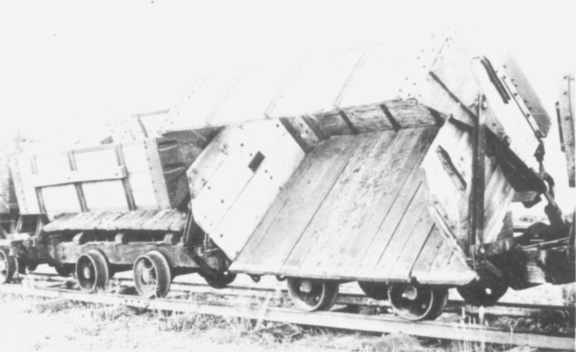 The wagons were stored on tracks at the side of the minor road from Esch to the Militärring road on the north-west side of Köln. There were two main varieties, both side-tipping. Some were of all metal construction and modern appearance whilst the others, of about the same capacity, were of mainly wooden construction. In both cases, the action of tipping the bodies caused the downward facing side to be lifted so allowing the contents to fall out. Tipping was effected by a long handle sticking out at right angles to the sides of the wagons. Only the wooden wagons appeared to have brakes and these were worked from a screwed rod and hand lever operated from a small platform across an extension to the main frame members at one end of the wagon.