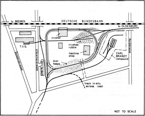 As the DB (Deutsche Bundesbahn) train from Oldenburg ran into Bremen it was possible to see narrow gauge steam locomotives trundling wooden tip wagons of rubble on the west side of the DB line just before the junction with the line from Bremerhaven. This was the 60cm gauge railway operated by Carl Brandt and which formerly ran from bombed sites in the harbour area. At the time of my visit in May 1957 there were still traces of narrow gauge rails across the nearby cobbled streets but the system had been reduced to carrying rubble brought in by lorries to a crushing plant for T. V. G., Bremen, makers of bricks from rubble.