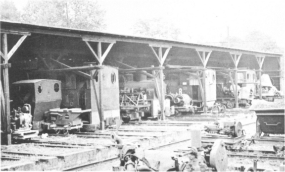 From near the road crossing close to the lorry tip, a line ran south along the foot of the dust heaps and embankments into a compound surrounded by an approximately 8ft high chain link fence surmounted by barbed wire. The compound housed the workshops for the railway and was used to store the wagons and locomotives after work each day. The steam locomotives stood in the open whilst the diesels were placed under an open-sided shelter formed by extending the roof of the workshops which were all built rather roughly of timber.