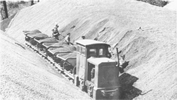 The crushed rubble was hand-loaded into steel V‑shaped hopper tip wagons hauled by an Orenstein & Koppel 4‑wheel diesel belonging to T. V. G. This company's system seemed very much entangled with that of Carl Brandt.
