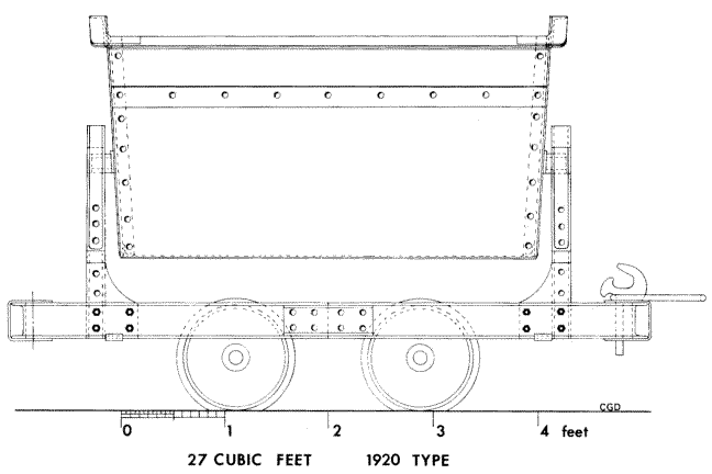 A brief mention of the usage of the word ‘skip’ might be of interest. In the south of England, the word implies the entire wagon but in other areas, Durham for example, usage is more precise, with only the body being termed the skip, while the frame and wheels constitute the 'tram’. There are no railway connotations at all in some cases, a skip being any form of receptacle, e.g. crane skips as used on building sites, or coal skips as in some collieries where skip winding is employed (although, in this latter usage, words such as kibble, bowk or hoppit are sometimes substituted). However, before becoming inextricably tangled in etymology, it would be best to continue with the article.