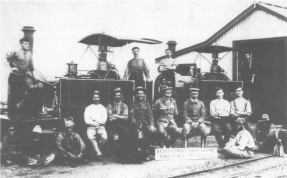 Blacks and whites pose together in pre-apartheid days on the Bezuidenhout Light Railway. The thoughtful positioning of heads enables us to read the worksplates and to say that Kerr Stuart 677 is on the left and 676 on the right. (Courtesy Hunslet Engine Co Ltd)