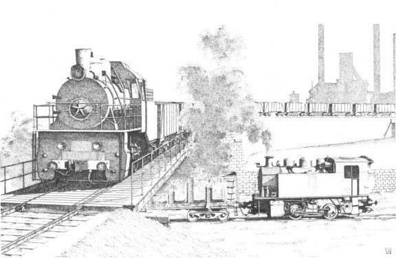 Whatever the truth of the matter, I have chosen one of the 0−4−0 tanks as the subject of my sketch, which depicts it at work near a Russian steelworks. The drawing is based entirely on the official Beyer Peacock works photograph, except that I have removed the British style headlamp from the smokebox door. The other locomotive is a standard class E 0−10−0 of which just under eleven thousand were built (with variations) between 1912 and about 1952.