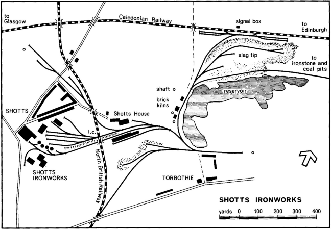 An ironworks was established at Shotts in Lanarkshire as early as 1802. In 1869 when the Caledonian Railway completed their line from Glasgow to Edinburgh via Cleland and Midcalder a connection was made 43 chains east of Shotts station and about 1¾ miles short of Benhar summit. A signal box was established here on the north side of the line (which is straight at this point), the sidings opposite being joined from the south-west by a curved and sharply rising branch 35 chains in length from the ironworks which was reached by a back-shunt. There was a signal at the entrance to the sidings from the branch, controlled from the box, but no special rules were laid down by the Shotts Iron Company for working over their line excepting that drivers were instructed "to run cautiously and at low speed". By the beginning of 1887 the ironworks had, according to William Love, furnace manager, a fleet of five engines, "four of which work by day, and there is a driver, fireman, and breaksman (sic) attached to each". They worked as required both to the Caledonian sidings and to the slag-hill, the drivers getting their orders every morning from the foreman.