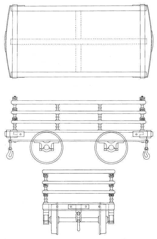 Fig 5 This drawing, dated 14th January 1873, is entitled "Truck for Incline Traffic for Cwmorthin Slate Quarry Co." and is typical of the general design of wagon used for carrying slate slabs on inclines in certain quarries. The end standards were of course intended to prevent the load coming adrift on the gradient. Curiously, however, although several quarries (notably Dinorwic) made use of similar wagons, which seem to be ideal for the job, a great many more relied upon the slab bogie of the type shown in Fig 8. This is one of the very few instances of a specific design of incline truck at Blaenau Ffestiniog that has come to my notice.