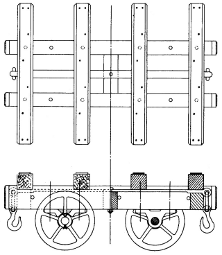 Fig 8 Titled "Slab Trolley for Messrs. Ashton & Green", this drawing is dated 22nd April 1875. The wagon is of fairly simple design, used for carrying blocks of slate, and its principal dimensions are: overall length 4ft 6in; width over frames 1ft 7in; width over bearers 3ft 0in; wheels 1ft 2in diameter over treads (approximately); and wheelbase 1ft 11in. The four bearers - many such wagons had only three, the fact being noted on the drawing - were faced with sheet iron 2¾in wide and 3/8in thick. It was usual to dispense with the centre frame spacer, the bearers and the end two transverse members providing sufficient rigidity. I am not certain which quarry Ashton & Green owned. However, other wagons to this design were requested by Rhosydd slate quarry. A note of 25th June 1881 required their wagons to have a frame 7in deep (rather than 6½in) and the whole wagon to be lowered. This was to be done by cutting recesses for the axle pedestals.