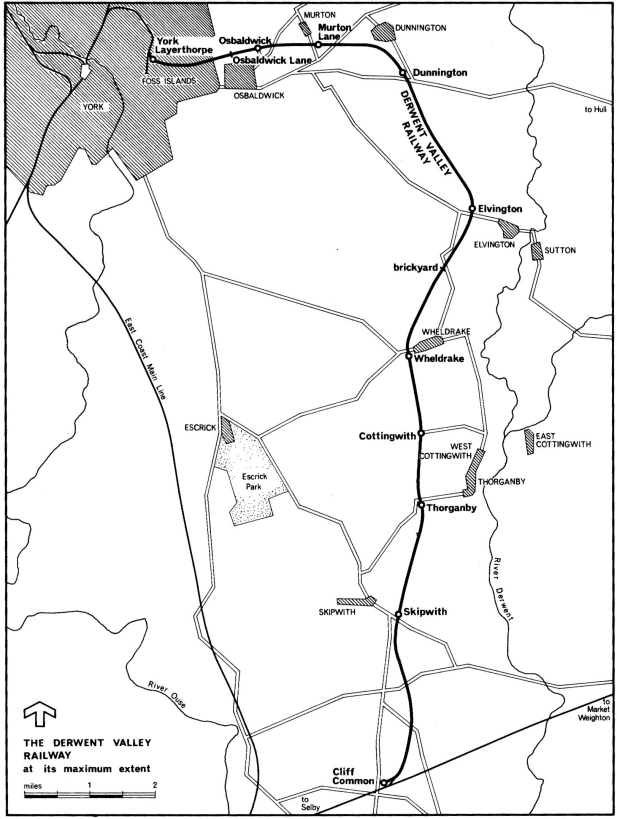 Agriform Fertiliser Ltd opened a depot at Elvington Station on 11th October 1966 and development has gone ahead with production and storage facilities being built on the site. Unfortunately the rail traffic anticipated has not materialised. Agriform, a company jointly owned by Imperial Chemical Industries Ltd and Hargreaves (West Riding) Ltd, had depots based on BR stations - facilities which BR have tended to withdraw rather than develop. The major outlet for the DVLR Agriform traffic was to be the Newark depot but this has been given to an agent who has a road haulage concern and wishes to handle supplies with his own lorries. The only other traffic originating between Elvington and Dunnington was sugar beet from three farms, and as this was also likely to cease (as mentioned later) this section was closed on 22nd October 1972, the last train having run on 22nd June 1972. The track was removed by Thos. W. Ward Ltd and, although the Company still owns the land at Elvington, the trackbed has been sold to local landowners. No redundancies were involved and Agriform have leased the whole station area for future development. The Derwent Valley Railway now consists of a single line 4 miles 20 chains in length between York (Layerthorpe) and Dunnington, together with sidings totalling 1 mile 65 chains. Details of the present situation at each site are given below.