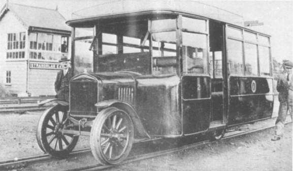 Passenger services reached a peak in 1915 with 49,383 passengers. The NER had agreed not to compete with their feeder and goods collection services, but despite the introduction of a DVLR feeder in the form of Mr A. Dawson's bus which ran between Sutton, Elvington and Elvington Station, passenger receipts declined with the improvement of road transport. Costs were cut by the use of twin Ford railbuses. While these were cheaper to run they were, like most of their breed, not very well regarded by passengers. Both railcars were purchased in May 1924 at a total cost of £1,070; each was built on a Ford 1‑ton truck chassis with bodywork by C.H. Roe Ltd of Leeds. Rated at 22hp, they weighed 2 tons 7 cwts, and were fitted with 17 seats. (Roe's are now part of the British Leyland Motor Corporation and other details for the railcars are obscure as their records for this period have been destroyed.) In order to use the units singly, small turntables were installed at Layerthorpe and Skipwith. During the General Strike in May 1926 the LNER borrowed the Ford railcars for use in the Harrogate area, but this was only a temporary measure. They were put up for sale in June 1926 and acquired by the County Donegal Railways for £480 the pair, arriving in Londonderry on 7th August 1926. Conversion to the 3ft gauge increased the total cost to £314 each. Before rebuilding they had looked somewhat wide and ungainly and this worried the CDR engineer. In the event, rather than narrow the body width drastically (from 7ft to 5ft 10in) it was decided to lower it over the rear wheels. These railcars were reasonably successful and lasted until 1934 when they were withdrawn from service.