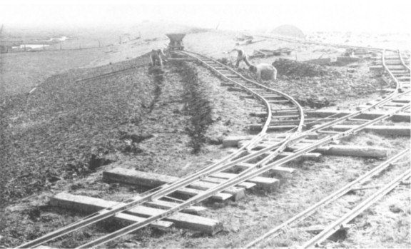 Reclaiming land from the sea in the area of The Wash is nothing new, for the Romans built an embankment to hold back the sea from The Haven to Skegness which was later improved by the Normans; this is still known as the Roman Bank. In more recent times unemployed youths from Jarrow were engaged on reclamation work along the coast during the early 1930's. The history of the railway at North Sea Camp really starts at the end of May 1935 when twenty boys arrived at the end of their long march from Stafford Prison to set up the second open borstal in the country. The rehabilitation scheme of reclamation work was begun in July 1936 with the building of an earth bank on the seaward side of the old Roman Bank. The bank had to be built to a height of 21ft 6in Newlyn[*] from a level of 10ft 0in Newlyn to ensure that even the highest tides would not flow over the top to destroy the work of many years labours. With the outbreak of the Second World War it was necessary for the embankment around the first enclosure to be finished quickly, and outside help was authorised.
