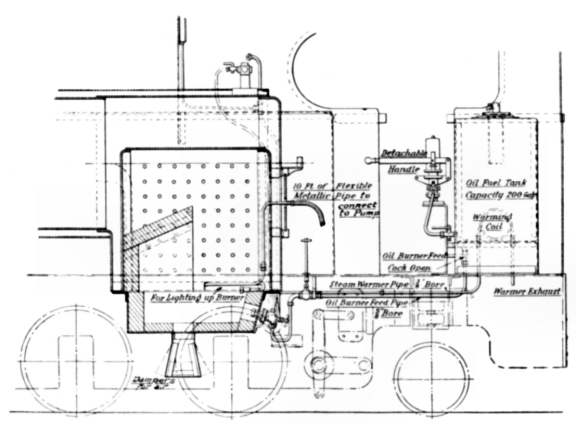 "As the oil burning arrangement will be of special interest to many of our readers abroad, we append a drawing showing the arrangement of the firebox, with its brickwork furnace, air ports, etc. Two oil burners of the Kermode type are used, supplied with steam for the spraying jets from a turret fitting, placed high up in the cab, which also accommodates the injector steam valves, the blower, whistle, and pressure gauge; a master valve is provided by which all these fittings can be shut off at any time with the locomotive under steam. The position of the burners and pipe connections for oil and steam are distinctly shown on the drawing; these are said to give excellent results in service. A novel device is fitted for raising steam, when this has to be done away from any stationary supply, and this was also supplied by Messrs. Kermode's. A coil of steel pipe, which has a fine spraying jet, or nozzle, at its extremity, is temporarily introduced into the furnace; oil fuel is supplied to this coil from a small hand pump, fixed, as shown, on the front of the oil tank. Lighted waste having been thrown in, a supply of oil fuel is maintained under pressure in the coil and sprayed from the fine "rifled" nozzle at the end. After a few minutes, quite a bright fire results, and the firebrick becoming sufficiently heated to ensure good combustion, steam can be raised from cold water in from sixty to seventy minutes. As soon as 10 lb. pressure is reached the fixed burners can be started, the temporary coil removed, and the pressure rapidly raised to the full working figure.