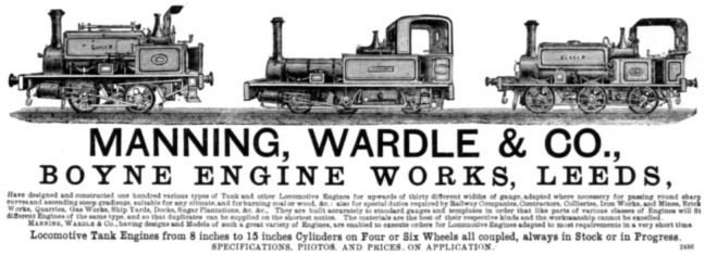 Most Manning Wardle locomotives were built to standard class designs. The class letters seem to have been revised about 1870 and latterly comprised A to I, old Class I, and K to Q. Two of the classes (both standard gauge) are shown in this advertisement from the issue of "Engineering" dated 16th July 1880 (for which the copy was kindly provided by Ralph Martin).