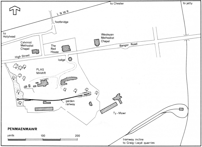 Layout of the grounds at Plas Mawr, the Darbishire's house at Penmaenmawr, showing the railway that REDSTONE was used on. A wooden loco shed and coal shed were situated at the western end of the line.