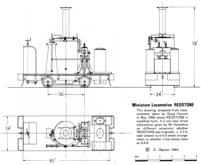 REDSTONE is essentially a 2ft gauge model of a 3ft gauge De Winton, for it has the characteristic inside frames of the 3ft gauge locomotive rather than the outside frames used on the standard 2ft gauge product. (The De Wintons at Graig Llwyd copied by foreman Redstone ran of course on 3ft gauge tracks.) REDSTONE has no springs of any sort as with a direct drive vertical engine it would not be practical to have the axle moving up and down when the cylinders are fixed. Only the rear of the rear wheels are braked and the rear bunker arrangement with a screw handbrake fitted into it is standard De Winton practice, as is the method of firing through a flap-door in the footplate with a chute to the firegrate. In fact, apart from the cylinders being arranged free standing and not attached to the boiler the engine presents all the usual De Winton characteristics. Lever reverse is fitted and two notches in the lever quadrant allow for some measure of "notching up"; the regulator handle is very tiny indeed. The front elevation drawing shows the original tank - not a conventional well tank - set between the frames (as on standard De Winton locomotives) and flanked by two extra water tanks. These, together with some blocks of metal underneath, were fitted at Trevor to increase adhesion. Larger tyres with wider tread and increased flanges were also fitted at Trevor to the disc pattern wheels: the original wheels may have been one‑piece castings. The side rods, wide in the centre and tapering towards the ends, have a form of bearing with non‑adjustable brasses; and these are understood to have been fitted at Trevor. The drawing shows REDSTONE in its modified form except for the original chimney: this is hinged to the boiler which contains 68 brass tubes. Leading dimensions are: cylinders, 4in diameter by 6in stroke; wheels, 1ft 11in diameter; length over buffers, 7ft 10in.