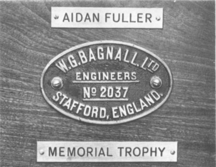The death of Aidan Fuller on 8th April 1973 occurred only a few weeks before the Society's Annual General Meeting. At that meeting there was unanimous approval of a resolution to honour him as a founder member, former Hon Treasurer, Secretary and, later, Chairman of the Society by the creation of a permanent tribute to his memory. Subsequently the Committee decided that this should take the form of a trophy to be awarded annually to the winner of a photographic competition. For the trophy itself a departure from the traditional silver cup was made in favour of something more in keeping with the hobby that brings us together, and probably as intrinsically valuable - an industrial locomotive maker's plate, suitably mounted on a wooden plaque. Our member Ray Fox undertook to make the trophy and provided the plate of Bagnall 2037, a locomotive that had worked at Castle Firebrick Co Ltd in Flintshire; the choice of plate was influenced by Aidan's particular interest in Wales.