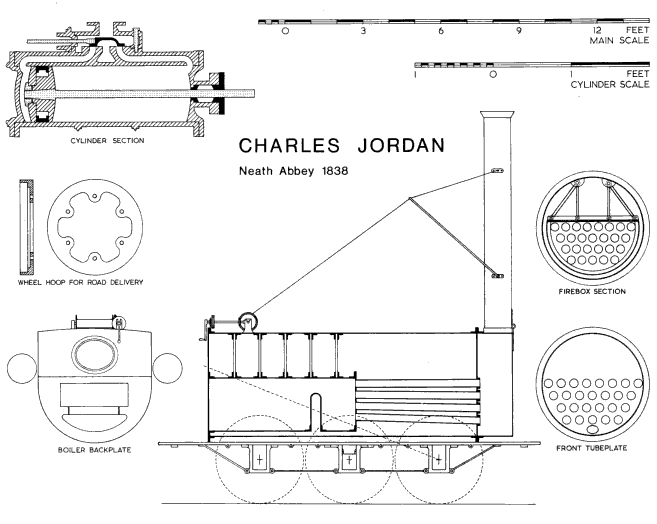 Like DOWLAIS, CHARLES JORDAN was delivered by road. On 16th February 1838 a document was signed: "It is agreed between William Baker & the Neath Abbey Iron Company on behalf of Guest Lewis & Company that the latter shall pay the former for taking a 6 Wheeled Locomotive Engine to Dowlais, the same price as he received for the "Mountaineer" Engine about 4 years ago, & that he shall be paid £4.10 for the Tender. The Dowlais Company to send 4 men to accompany the Engine. W. Baker to bring back any Tools or Apparatus taken from Neath Abbey". This is odd, since MOUNTAINEER travelled by sea; perhaps they meant DOWLAIS in 1836. Hoops were again attached to the wheels for the journey, but the drawing of them is also mysterious, since their outer diameter makes them too large for the close-set wheels. It could have been managed by removing the centre wheels, but six hoops were cast. The springs seem to have suffered in the process, as a month later Dowlais was ordering replacements for CHARLES JORDAN.