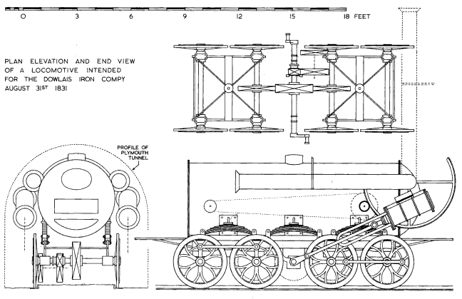 This is the sum of the useful contemporary evidence. From it we can be sure of several things. There was a single cylinder 8¼ in by 54in; the primary sources do not say whether it was horizontal or vertical, and in other engines Trevithick used both types, recessed completely into the boiler. But a vertical cylinder is ruled out in this case, since the end of the piston rod at the top of the stroke would be a good 9ft above the base of the cylinder, and Plymouth tunnel was only 8ft high. The boiler was cast iron 4ft 3in by 6ft. The chimney stood about 11ft high above the firebox, and must have been lowerable to pass the tunnel; the moving of the track in the tunnel , was most likely to allow the flywheel to fit. Though there is no direct evidence for the flywheel, it is difficult to imagine that there was not one. The exhaust was turned into the chimney where Trevithick found that it helped the fire to draw. The later "Battle of the Blast Pipe" was thus largely a vain one, since the principle dated back to the beginnings of the locomotive and the only real improvement of later days was Hackworth's nozzling of the orifice. The engine weighed about 5 tons in working order, and travelled at 4 to 5mph. The statement that "the engine moves forth 9 feet every stroake" is not crystal clear, but it surely ties in with Trevithick's earlier remark that "it is to have the same velocity of the piston rod", namely that for each single 4ft 6in stroke of the piston it travelled 4ft 6in on the rails, or 9ft for each return stroke. If this is so, and the gear ratio was 1 to 1, the wheels were rather over 2ft 10in in diameter; but this is only guesswork. Geared it must have been, though, in view of the enormous stroke. The engine could be put to non-railway work without its wheels, which implies a belt drive off the crankshaft or a crank drive off the flywheel.