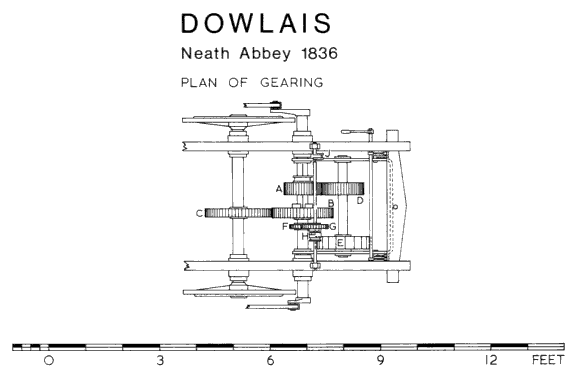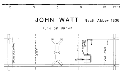 Having established the general idea, Neath Abbey proceeded to amend the design in most of its details, and there are no more general arrangement drawings. Instead there is a series of fifty drawings of components dated (where they bear a date at all) between 14th October 1831 and 23rd May 1832. From these the overall drawings given here have been built up. But there are many difficulties in using the Neath Abbey drawings. Details were clearly evolved as work proceeded; for some parts there are conflicting versions, and the exact location of other components — such as the dome, steam manifold and feed pump — is a matter of deduction and may be slightly wrong. For some parts, especially safety valve and control levers for rack, clutch and reversing, there are no drawings.