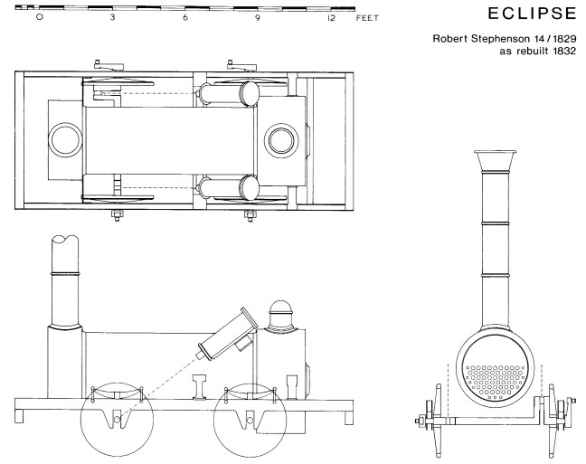 How long the ECLIPSE continued to work is unknown, though we can hazard a guess at its final home. The accepted (but inaccurate) list of early Stephenson products gives number 14 to DUDLEY, supplied in 1828 to the Earl of Dudley. This cannot be, since the original Stephenson papers are quite ignorant of it, and the historians of the Pensett Railway make it clear that apart from AGENORIA there was no locomotive on the Dudley system so early. But they do say that the line acquired a second-hand engine, details unknown, in 1846; and though the cylinder dimensions ascribed by the list to DUDLEY (9in by 24in) differ from ECLIPSE'S (7in by 20in) the works number coincides. Penydarren may therefore have sold ECLIPSE directly or indirectly to Staffordshire, where it would need new wheels for the standard gauge. DUDLEY is said to have been rebuilt as an 0‑4‑0 saddle tank at Castle Mill in 1906.