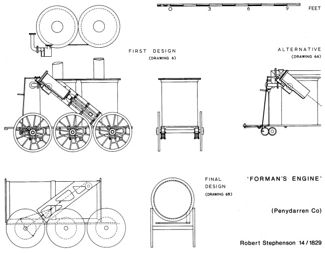 After 1804, apart from the odd isolated experiment [1], South Wales knew no locos until 1829, when the first of a long series of industrial engines arrived. Robert Stephenson & Company were the first in the field with a locomotive ordered in November 1828 by William Forman, by then the senior partner in the Penydarren works. The original plans, undated but attributable to late 1828 or early 1829, show an 0‑6‑0 with twin vertical boilers after the fashion of the TWIN SISTERS then being built as the first engine for the Liverpool & Manchester. It was to have plateway wheels 3ft in diameter and set at 3ft 1½in inside gauge for running on rails of 3ft gauge, steeply inclined cylinders and valve motion driven by gears on the rear axle and by rocker arms. But the design was drastically changed, for an outline drawing dated July 1829 shows a horizontal boiler 2ft 9in by 7ft 2¾in, and the Engine Description Book confirms that as built the engine had a single non-return elliptical flue (this being just before the ROCKET and the multitubular boiler). The chimney was no doubt bent up through 90 degrees from the front of the flue. The cylinders, 7in by 20in, were inclined and mounted on the boiler back; the frames were of flat bar 3in by 1in, and the wheels were 3ft. The works number was 14 (not 16 as Dendy Marshall and others imply). The Penydarren engine, in a packing case, was dispatched by sea from Newcastle on 18th July 1829, together with BRITANNIA for Tredegar which, though smaller, it much resembled; and it was delivered at the Tredegar Iron Company's Pillgwenlly wharf at Newport whence it was presumably taken on to Penydarren by road. It cost £375 plus £19 odd for freight, packing and extras.