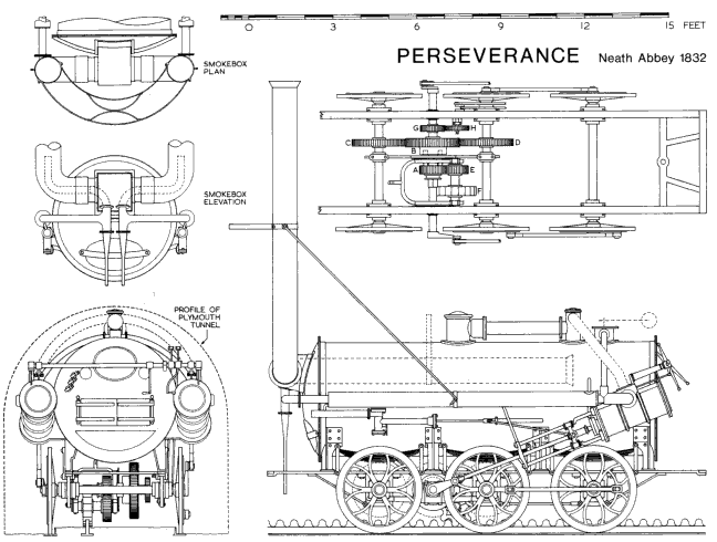 Dowlais was quick in rejecting the plan, for on 14th September 1831 Neath Abbey produced another drawing for a rather simpler engine. It approaches the final design as actually built in the form of PERSEVERANCE, to be described shortly; but it had a shorter boiler, a shorter wheelbase and a flat front to the boiler with a small and awkward smokebox near the base from which a vertical flue rose to a pair of swivelling chimneys. The cylinders project much more behind the boiler, and on the crankshaft a clutch puts either the adhesion drive pinion or the rack drive pinion into mesh. The cylinders are 10½in by 20in, and the wheels 3ft 1in in diameter. Evidently the design met with approval from the Dowlais engineer, who endorsed the drawing for the guidance of Neath Abbey: "The Engine including boiler wheels &c complete not to exceed 8 Tons. The difference in level of the Boiler in some parts of the Road will be 2 Ins p Yard. The Horizontal Tubes would be preferred in the Boiler if Mess. Neath Abbey Co who are responsible for the performance of the Engine think proper. Speed of Engine 7 Miles p hour. The Engine to be reed to put on the Road before the 25th March".
