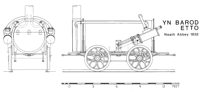Both Jones and Stephenson were too late, for on 27th July Neath Abbey had confirmed an order, which Dowlais had placed a day or two before through Charles Jordan, for "a Locomotive Engine of 2 - 8½" Cylinders to run on 4 wheels adapted for a Rail as well as Tram Road — to be ready on the 23rd of October subject to a fine of 5£ p week for all time after that period. The price for the same to be £420". Named YN BAROD ETTO ("Ever-ready") it was a very straightforward affair compared to PERSEVERANCE. The rear cylinders, 8½ by 20in, drove direct to the front axle, so it had no gearing. The four coupled wheels were designed to run on either plate or edge rail. This was achieved by fitting flanged wheels of the type required for edge rail, and making these of such dimensions that when used on plate rails they ran on the edge of their unusually thick flanges. The gauge inside the wheel flanges was 4ft 6in as usual, the edge gauge 4ft 8in; the diameter was 3ft 4in over the flanges and 2ft 10in on the edge wheel tread.