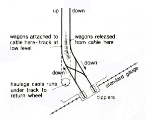 At the foot of the incline wagons were unfastened from the cable and run by gravity and their own momentum to one of two tipplers. These had the axis of rotation at rail level and were designed to be stable when containing an empty wagon but top heavy with a full one, so it was only necessary to release the brake for the tippler to make a complete revolution. The empty wagon was then pulled out by hand and run down a short incline to be attached to the cable for the return journey. Reaching the summit, the empties track climbed slightly higher than that for the waiting loaded wagons so that there was a down gradient away from the incline head to carry released empty wagons into the reception sidings. The incline was self-acting with a brakedrum at the summit: at the foot the cable was carried round an idler wheel, which was mounted in a carriage fastened to a tensioning weight. The wagons were of all metal construction with a large wooden buffer at each end.