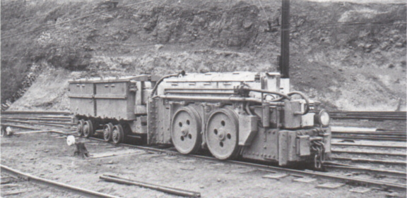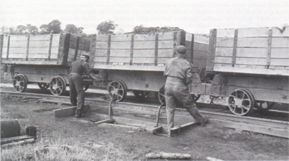 When hand loading was practised gangs of men worked the whole length of the face - say 500 yards - and each gang had two or three wagons to fill, so empties had to be distributed along the length of the quarry. The arrival of the excavator simplified these arrangements: empties were left near it and single wagons were pushed nearer by hand for filling, after which they were pushed farther on ready for collection. In the absence of a locomotive, the rake of empties was periodically moved forward by the excavator. A length of wire rope was attached to the bucket and the leading wagon, then the excavator slewed and racked out its bucket arm, so hauling the wagons along. Loaded wagons were often given an initial push by putting the bucket against the wagon end and slewing, a practice which no doubt accounted for many of the broken wagon bodies in later days.